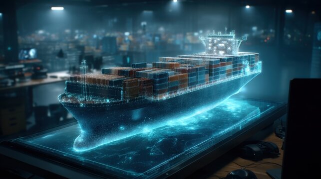 Futuristic holographic representation of a cargo ship with container stacks displayed in a modern tech workspace illuminated by ambient lighting