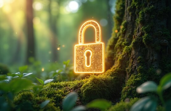 Glowing padlock hologram hovers near mossy tree trunk in forest. Digital security icon represents data safety, privacy, encryption tech. Nature, trees, foliage create eco concept. Symbol of