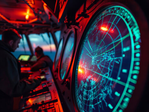 Hands Operating Futuristic Sonar Unit Control Dashboard with Advanced Electronic Displays and Illuminated Interfaces