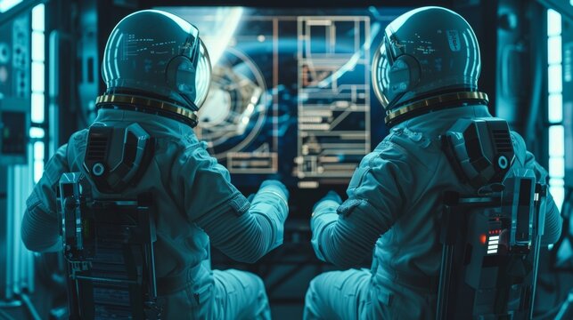 Two astronauts sit side by side focused on a holographic display that showcases detailed schematics of spacecraft. The sleek . .