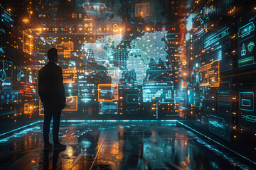 An engineer interacts with holographic interfaces inside a high-tech data center full of illuminated server racks..