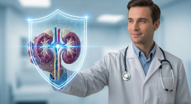 Doctor holding holographic shield with padlock in healthcare security concept