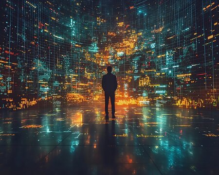 Data analyst in virtual space with holographic charts and globe