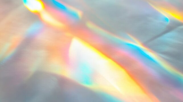 Blurred texture overlay of rainbow light refraction for photos and mockups Organic diagonal holographic flare on a white surface creating natural light shadow effects