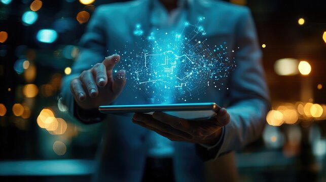 Artificial intelligence hologram projecting from a tablet held by a business professional
