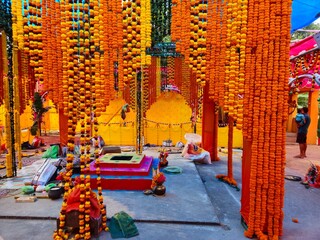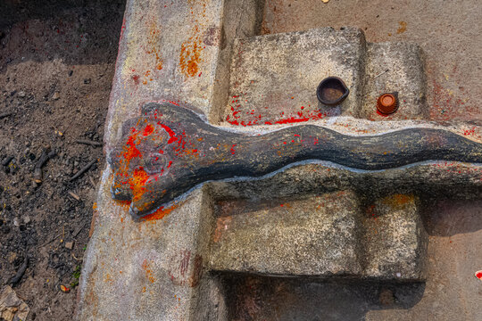 Havan kund puja in Hindu Temple. Lotus shaped Yajna Kunda ( Homa Kundm(sanskrit) or Agni Kundam).A yajna kunda or ritual pit for offerings to the sacred fire at a Hindu temple in Odisha,India