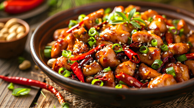 Appetizing Kung Pao Chicken Dish Served in Traditional Bowl Embellished with Vital Asian Ingredients