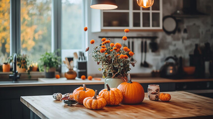 Modern kitchen interior decorated for fall with orange pumpkins, autumn home decoration
