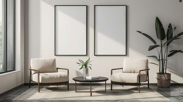 White theme livning room wiith white frame poster, interior design