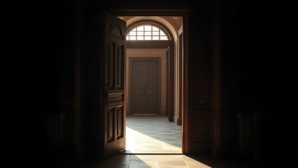 flawlessness. A heavy wooden door opens to a bright corridor with dramatic side lighting. real-estate listings, architecture portfolios, designed for interior renovation comparisons for interiors.
