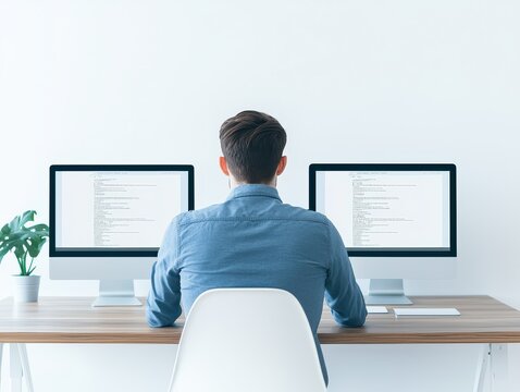 A person works at a modern desk with two monitors, focused on digital projects, surrounded by a minimalist style.