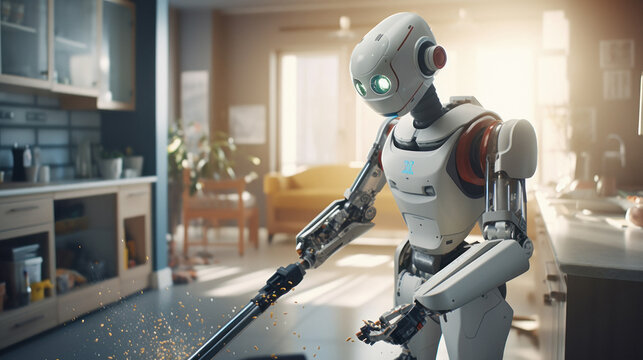 Automated Home Companion: A futuristic home scene features an advanced robotic assistant navigating a sunlit living space.
