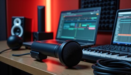 Red-Lit Home Studio Setup with USB Microphone and DAW Software
