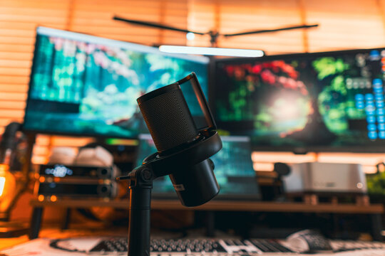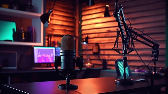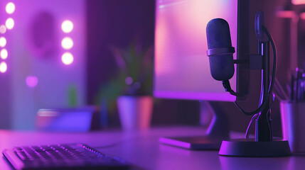 Modern podcast setup with professional microphone on boom arm in cozy home studio, featuring blurred monitors and wooden blinds background. Creative workspace inspiration.