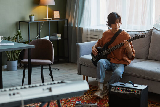 Full length portrait of young man playing electric guitar in cozy home music studio, copy space