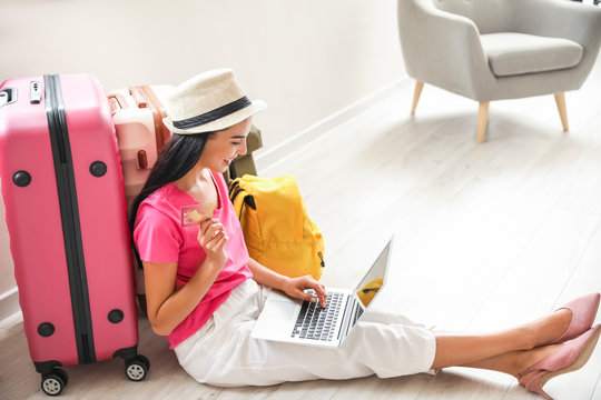 Woman with laptop booking tickets online at home