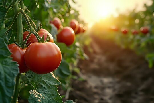 Fresh ripe tomatoes growing on vine in organic garden at sunset, natural sunlight creating warm atmosphere through green leaves and soil background.