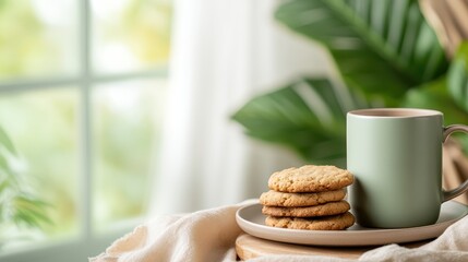 A warm and inviting scene featuring a cup of coffee next to a plate of cookies, beautifully arranged on a cozy table, suggesting relaxation and enjoyment in a homey atmosphere.