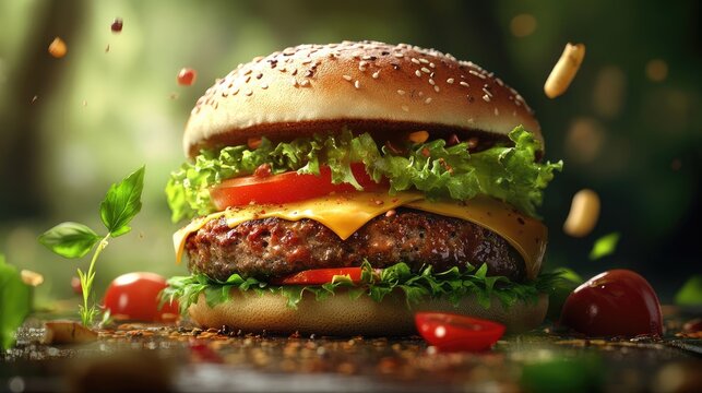 Juicy gourmet hamburger with fresh vegetables and melted cheese on a rustic wooden table surrounded by natural elements
