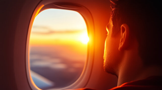 Wide angle shot of a sunset fading behind an airplane window with a person resting their head against the window symbolizing the end of a vacation and return to reality