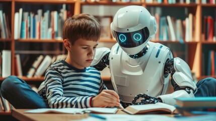 Innovative AI robot tutor helping a teenage boy with homework, they are reading books together, human-robot interaction concept