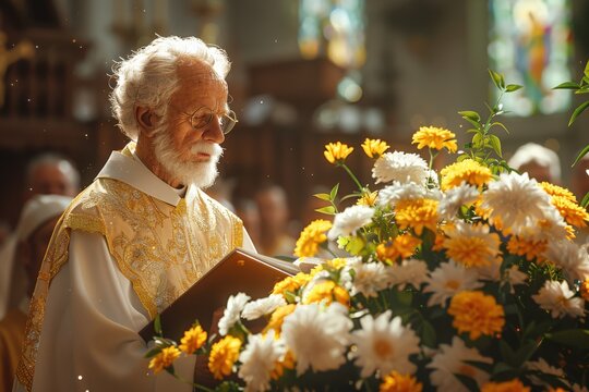 Senior Priest in Gold Vestments Reads from Book Amidst Yellow and White Flowers in Sunlit Church Setting with Stained Glass WindowsSenior priest