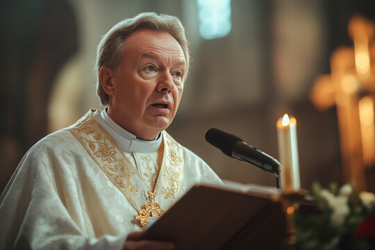 Priest preaching, Catholic clergy at church altar, sharing Gospel message.