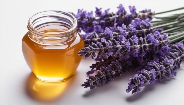A jar of honey next to a bunch of lavender