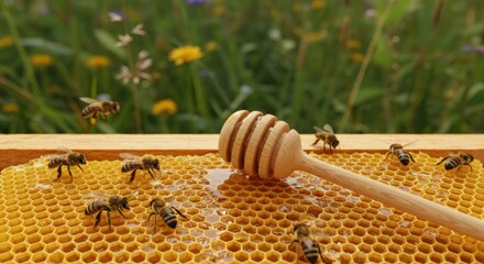 Honeycomb Harvest: Bees Working on Golden Honeycomb with Honey Dipper