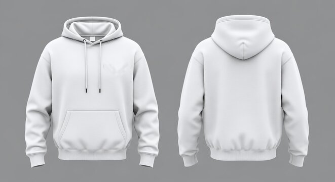 Front and back view of a white hooded sweatshirt with a front pocket and drawstring