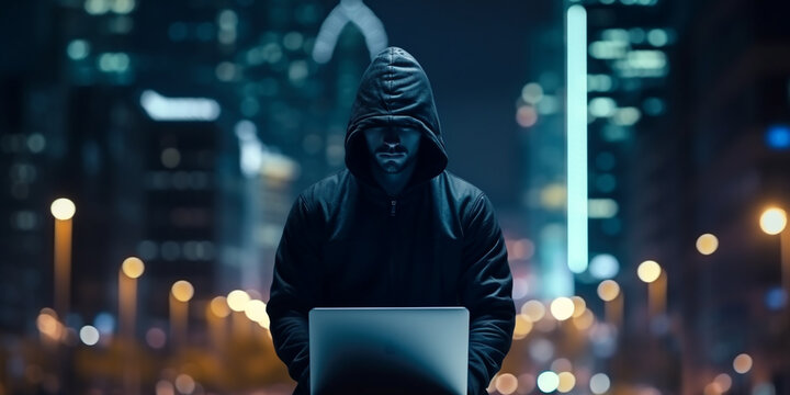 Security and Hacking. Hooded Hacker Looking at the Camera Working on a Laptop in the City at Night.