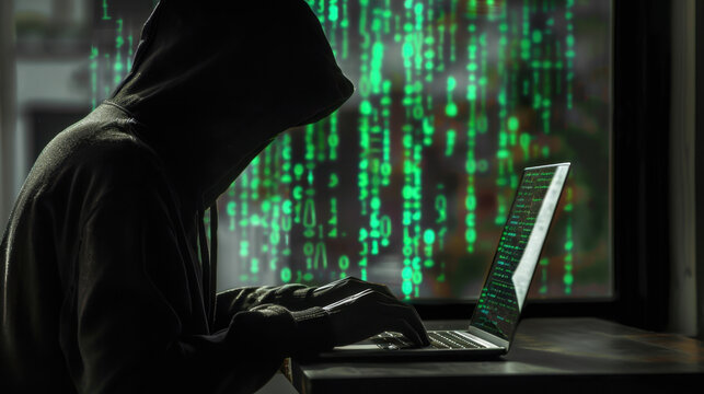 hooded figure working on laptop with green binary code in background, symbolizing hacking and cybersecurity. atmosphere is mysterious and tech focused
