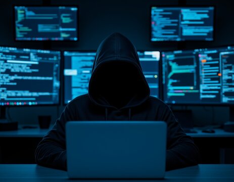 Mysterious Hooded Figure Engaged in Cyber Activity in Dark Room with Multiple Screens