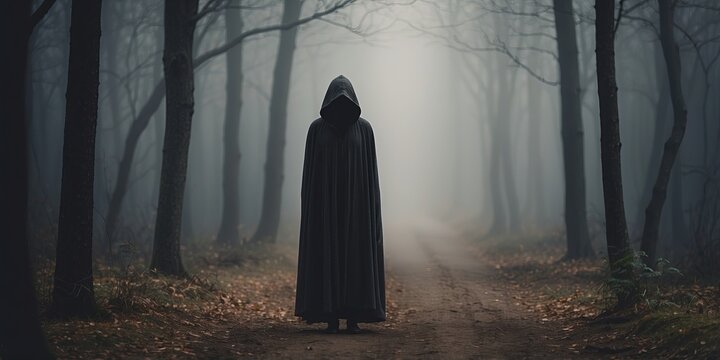 Mysterious hooded figure in an eerie foggy forest.