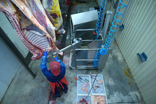 At the slaughterhouse. Worker skin carcass of a caw using hoist and knife