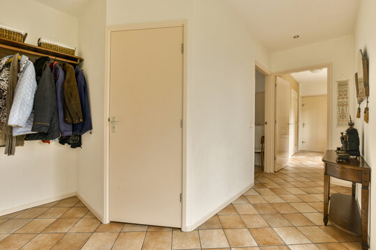Coats and clothes hanging on a wall in a hallway, perfect for interior design or everyday life