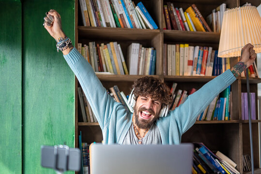 influencer with beard and tattoos rejoices in front of his followers, connections through modern technology, internet, music, social networks, new jobs as bloggers and multimedia content creators