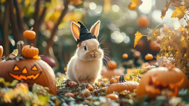 Fluffy Bunny with Tiny Hat Among Autumn Pumpkins