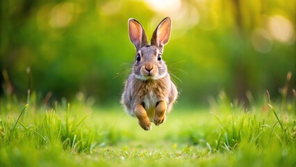 Leaping brown rabbit racing across sunlit meadow with motion blur and lens flare, blue sky