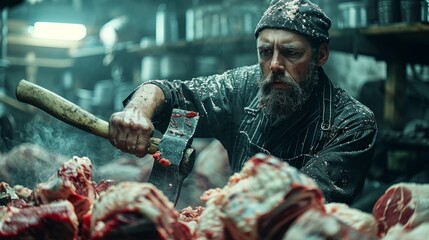 Lost in a chilling dance with his axe, the butcher conducts a macabre ballet within the bloody confines of a private, medieval-styled abattoir.
