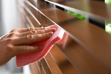Brown wooden blinds decorate in house on window.