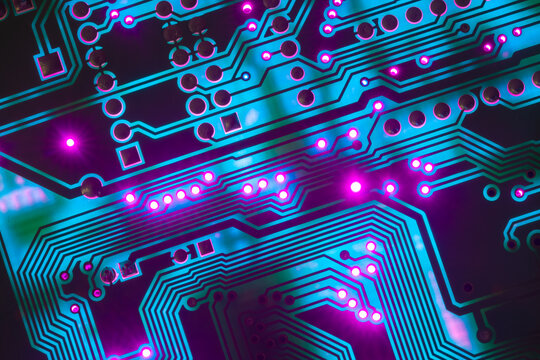 A detailed shot of a computer motherboard, with intricate circuits and microchips in hyper-detail.