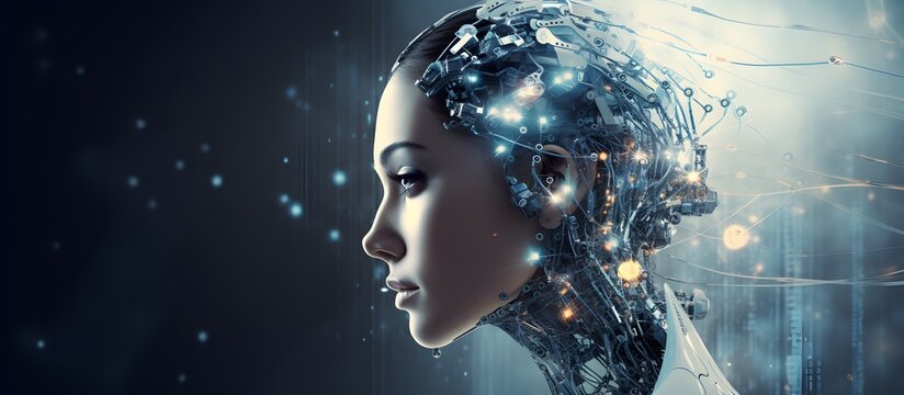 Futuristic cyborg woman wearing intricate metallic circuit crown with led wiring at dusk