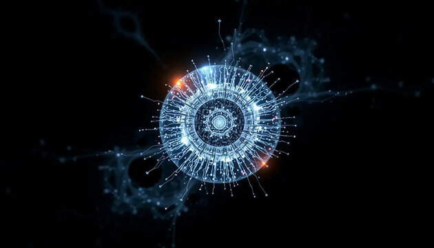 Glowing neural circuit brain pulsing above glossy cyber plane with floating metrics