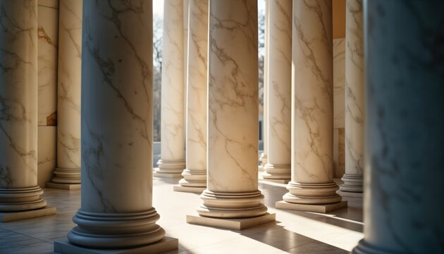 Elegant marble columns stand in colonnade bathed in natural light. Play of shadows, highlights enhances classical charm of architectural elements. Columns timeless design. Ancient style. Beautiful