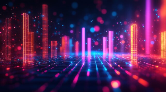 Digital background featuring colorful bar graph and line chart, glowing light effects on a dark backdrop, financial graphs with neon accents