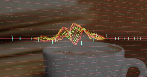 Porcelain coffee mug displaying translucent chart overlay with neon lines and candlesticks