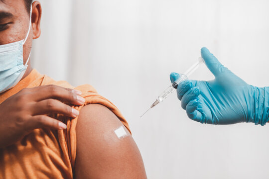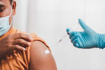 Young man wearing a protective mask Show plaster on the shoulder After vaccination against covid-19 health care guidelines health protection Vaccine Effects