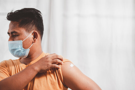 Young man wearing a protective mask Show plaster on the shoulder After vaccination against covid-19 health care guidelines health protection Vaccine Effects