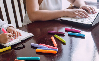 Baby girl hand holding black white color pen and writing on light pink table background. Pastel color. Closeup. Wide banner. Empty place for text. Top down view.